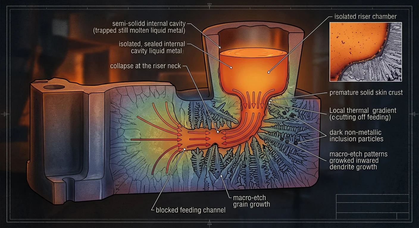Non-metallic particles act as thermal insulators. Their conductivity sits far below the surrounding metal. They collect at the riser neck — that’s where slow flow and solidification fronts meet. Once they gather there, they create a localized cold zone. A patch of metal that cools faster than everything around it.